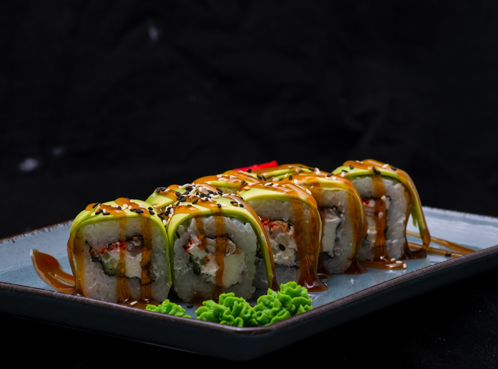 ogórek, awokado, ser philadelphia, kawior tobiko, omlet tamago, łosoś, ryżowy papier, sos sojowy, imbir, wasabi